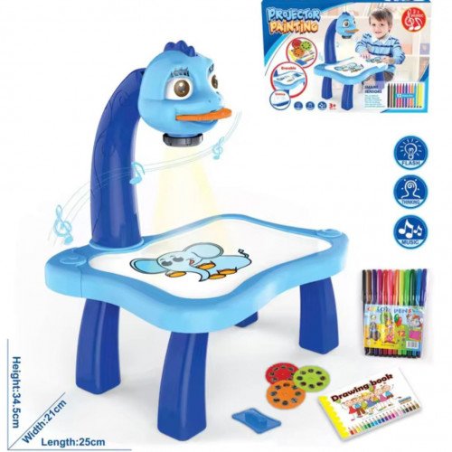 Su estructura ergonómica y resistente está pensada para acompañar el crecimiento del niño, mientras que el proyector estimula la coordinación visual y motora, convirtiendo cada sesión de dibujo en una experiencia interactiva y divertida. El color azul vibrante aporta calma y enfoque, ideal para momentos de concentración.